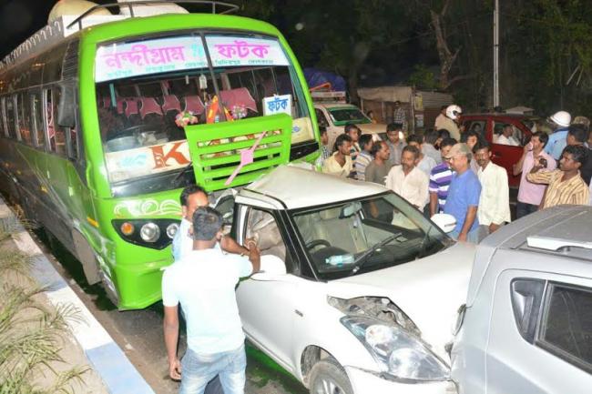 Kolkata, May 30 (IBNS): At least four persons were injured on Monday late evening, when a speeding bus crashed into as many as five other cars, which were standing at a traffic signal on Kona Expressway, at Bator Crossing area in West Bengal's Howrah district, 10 kilometres away from Kolkata, reports said.