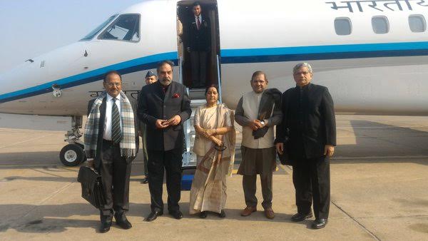 Speaking on Swaraj's visit to Nepal, MEA spokesperson Vikas Swarup tweeted: "EAM accompanied by MPs Anand Sharma, @SitaramYechury, Sharad Yadav & NSA Ajit Doval as she leaves for Kathmandu."