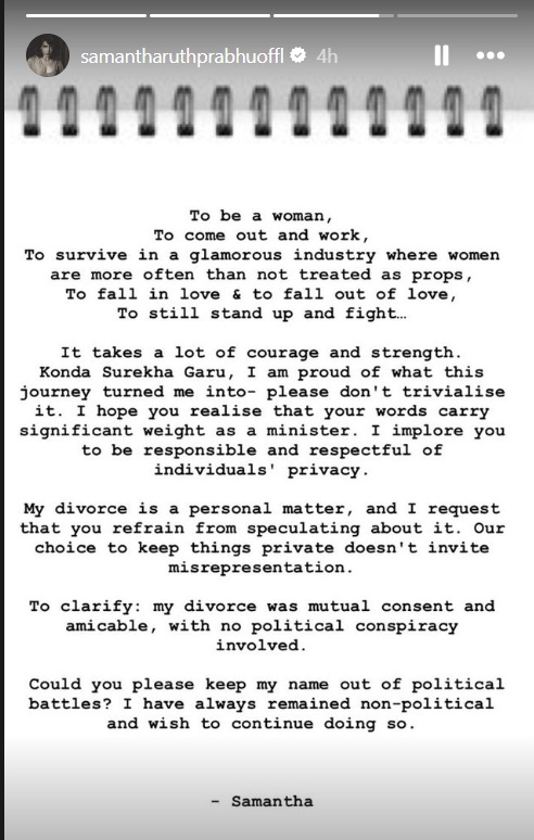 "I strongly condemn the comments of the Honorable Minister Mrs. Konda Surekha. Don't use the lives of movie stars who stay away from politics to criticize your opponents. Please respect other people's privacy," read a rough translation of his post on X, formerly Twitter.