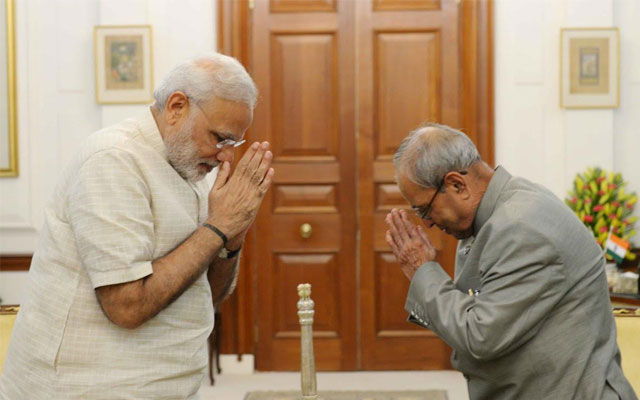 The official Twitter handle of the President of India posted: "PM @narendramodi called on #PresidentMukherjee at Rashtrapati Bhavan this evening & held discussions with President."