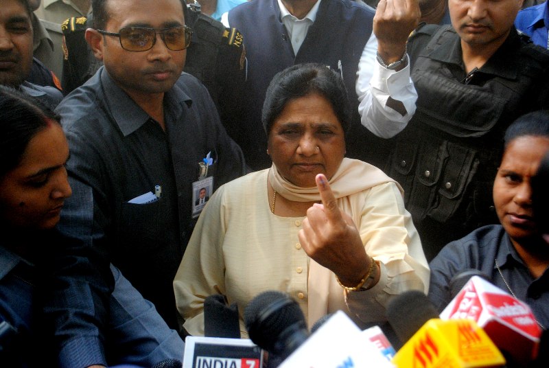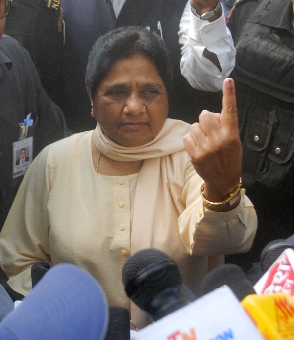 LUCKNOW, MAY 6 (UNI) BSP supremo Mayawati shows her inked finger after casting vote at a polling booth during the fifth phase of the Lok Sabha polls in Lucknow on Monday.