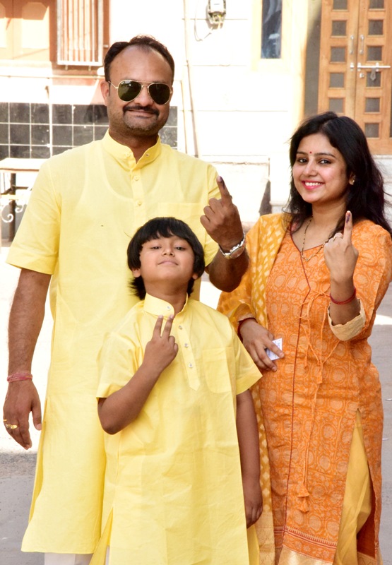 BIKANER,MAY 6(UNI) Bikaner MLA Princess Siddhi Kumari alongwith family members showing their inked fingers after casting their vote at a polling station during the fifth phase of the 2019 Lok Sabha elections, in Bikaner on Monday