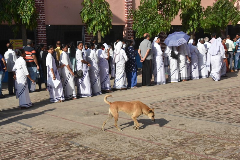 RANCHI, MAY 6 (UNI):- Nuns show voter ID cards as they stand in a queue to cast their vote inside a school building turned polling station during 5th phase of Lok Shabha Election in Ranchi, on Monday.