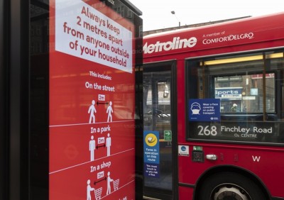 LONDON, June 11, 2020 (Xinhua) -- A notice about wearing face coverings is seen on a red bus in London, Britain on June 10, 2020. Face coverings will be compulsory on public transport in England from June 15 to help contain the transmission of the novel coronavirus, British Transport Secretary Grant Shapps said on June 4.