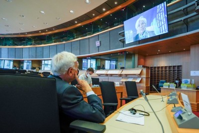 .BRUSSELS, June 9, 2020 (Xinhua) -- European Central Bank (ECB) President Christine Lagarde (on screen) speaks during a hearing at the Committee on Economic and Monetary Affairs of the European Parliament via video conference in Brussels, Belgium, June 8, 2020. Christine Lagarde said Monday that the central banks measures taken in response to the coronavirus crisis are proportionate to the severe risks facing its mandate.