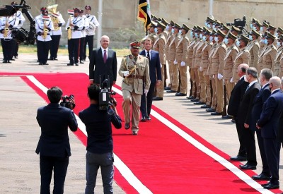 BAGHDAD, Sept. 3, 2020 (Xinhua) -- Iraqi President Barham Salih (C-L) and French President Emmanuel Macron (C-R) review a guard of honor in Baghdad, Iraq, on Sept. 2, 2020. Iraqi President Barham Salih on Wednesday met with his French counterpart Emmanuel Macron in Baghdad to discuss bilateral ties and the war against the Islamic State (IS) group.