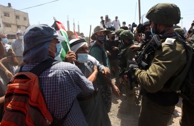 SALFIT, AUG. 29, 2020 (Xinhua) -- Palestinian protesters clash with Israeli soldiers during a protest against the expansion of Jewish settlements and the Israeli annexation plan, in the village of Kifl Haris near the West Bank city of Salfit, on Aug. 28, 2020.