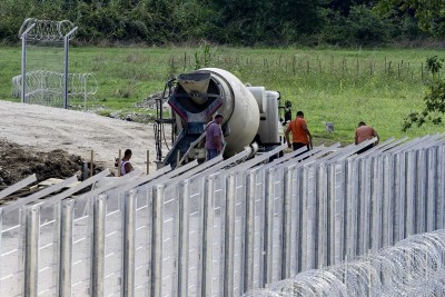 TABANOVCE, Aug. 21 (Xinhua) -- Workers build the fence on the border between North Macedonia and Serbia in Tabanovce, North Macedonia, Aug. 20, 2020. According to Serbian authorities, the fence will increase security of the border on the Balkan route that migrants are using for their final destination.