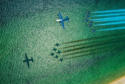 PENSACOLA, AUG 21 (UNI):-U S Navys Blue Angels in a delta formation fly over the beaches of Pensacola, Florida on Friday.