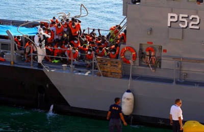 SENGLEA (MALTA), Aug. 21 (Xinhua) -- Migrants wait for disembarkation from a patrol boat of the Armed Forces of Malta (AFM) in Senglea, Malta, on Aug. 20, 2020. The Armed Forces of Malta rescued a group of 118 migrants, including 10 women, five children and a baby, after their boat was sinking and the migrants were drowning, Home Affairs Minister Byron Camilleri said on Thursday.