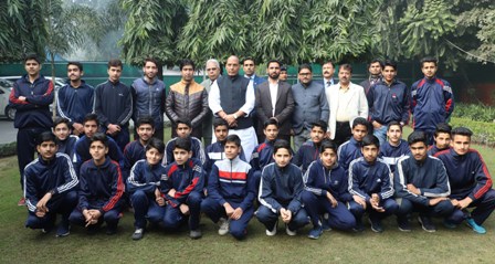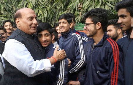 A group of school children from Srinagar (J&K) calling on the Union Home Minister, Rajnath Singh, in New Delhi on January 17, 2018.