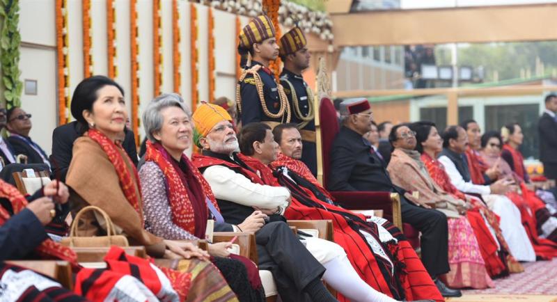 The President, Ram Nath Kovind, the Vice President, M. Venkaiah Naidu, the Prime Minister, Narendra Modi and other dignitaries, at Rajpath, on the occasion of the 69th Republic Day Parade 2018, in New Delhi.