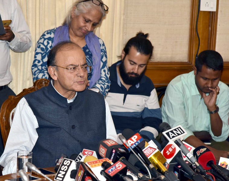 The Union Minister for Finance and Corporate Affairs, Arun Jaitley addressing the media on the issues relating to Andhra Pradesh, in New Delhi on March 07, 2018. The Secretary, Department of Expenditure, Ajay Narayan Jha is also seen.