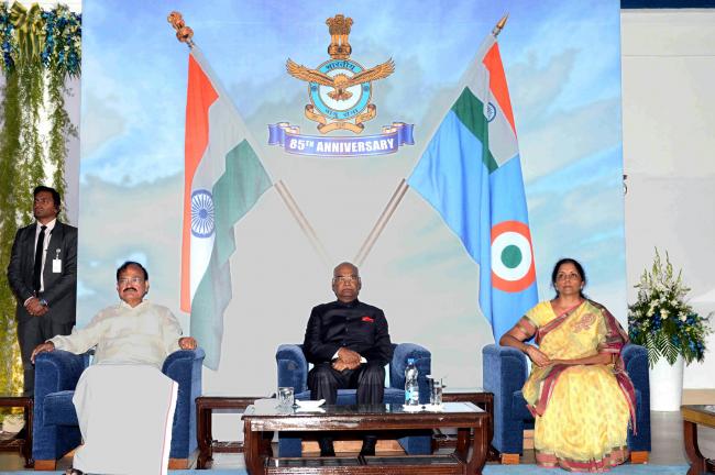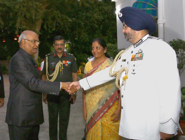 The President, Ram Nath Kovind shaking hands with the Chief of the Air Staff, Air Chief Marshal B.S. Dhanoa after his arrival, on the occasion of 85th Anniversary of Indian Air Force, at Air House, in New Delhi on October 08, 2017. The Union Minister for Defence, Nirmala Sitharaman is also seen.