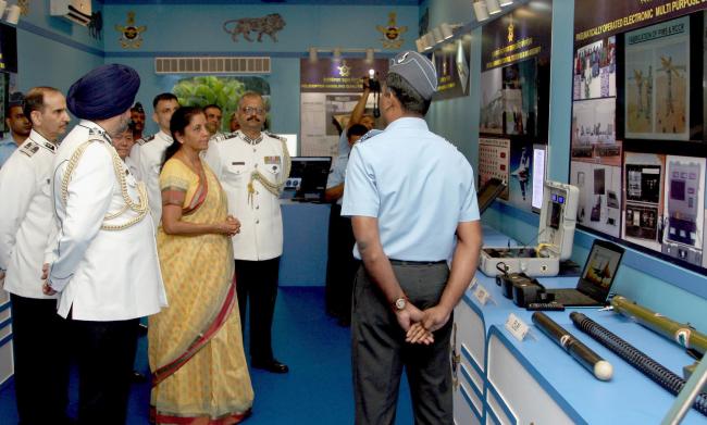 The Union Minister for Defence, Nirmala Sitharaman taking a look at the exhibition displayed, on the occasion of 85th Anniversary of Indian Air Force, at Air House, in New Delhi on October 08, 2017. The Chief of the Air Staff, Air Chief Marshal B.S. Dhanoa is also seen.
