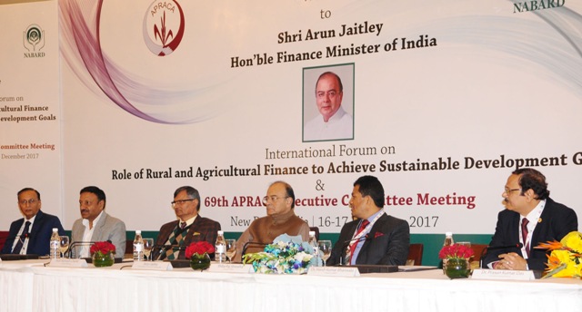 The Union Minister for Finance and Corporate Affairs, Arun Jaitley addressing the gathering at the International Forum on Role of Rural and Agricultural Finance to Achieve Sustainable Development Goals and 69th APRACA Executive Committee Meeting, hosted by NABARD, in New Delhi on December 16, 2017.