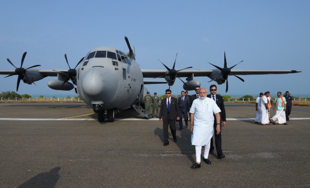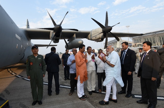 The Prime Minister, Narendra Modi emplanes for Lakshadweep from Mangaluru, to review the situation that has arisen due to Cyclone Ockhi, on December 19, 2017.