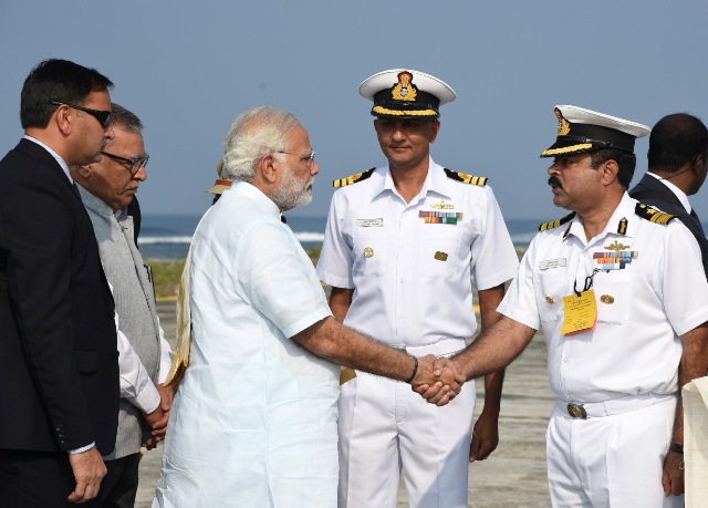 The Prime Minister, Narendra Modi arrives, at Lakshadweep to review the situation arisen due to Cyclone Ockhi, on December 19, 2017.