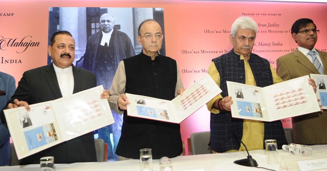 The Union Minister for Finance and Corporate Affairs, Arun Jaitley, the Minister of State for Communications (I/C) and Railways, Manoj Sinha and the Minister of State for Development of North Eastern Region (I/C), Prime Minister’s Office, Personnel, Public Grievances & Pensions, Atomic Energy and Space, Dr. Jitendra Singh releasing a Commemorative Postage Stamp on Justice Mehr Chand Mahajan, Third Chief Justice of India, in New Delhi on December 31, 2017.