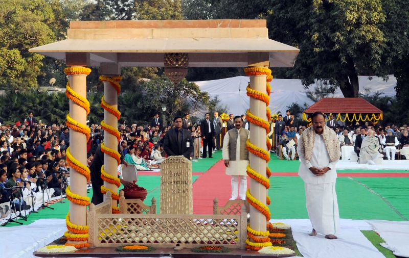 The Vice President, M. Venkaiah Naidu paying homage at the Gandhi Smriti, on the occasion of the Martyrs’ Day, in New Delhi on January 30, 2018. The Minister of State for Culture (I/C) and Environment, Forest & Climate Change, Dr. Mahesh Sharma is also seen.