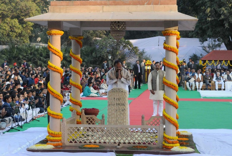 The Vice President, M. Venkaiah Naidu performing Parikrama at the Gandhi Smriti, on the occasion of the Martyrs’ Day, in New Delhi on January 30, 2018. The Minister of State for Culture (I/C) and Environment, Forest & Climate Change, Dr. Mahesh Sharma is also seen.