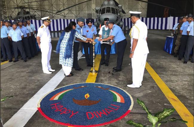 The Union Minister for Defence, Nirmala Sitharaman celebrating Diwali with the Air Force personnel, at Air Base in Car Nicobar under Andaman & Nicobar Command, on October 19, 2017.