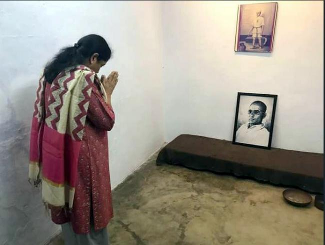 The Union Minister for Defence, Nirmala Sitharaman paying respect to Veer Savarkar on her visit to the Cellular Jail, at Andaman and Nicobar Islands, on October 19, 2017.