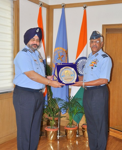 The Chief of the Air Staff, Air Chief Marshal B.S. Dhanoa being presented a memento by the Air Officer Commanding-in-Chief, Training Command, Air Marshal S.R.K. Nair, during his visit to Headquarters Training Command, Indian Air Force, in Bengaluru on December 07, 2017.