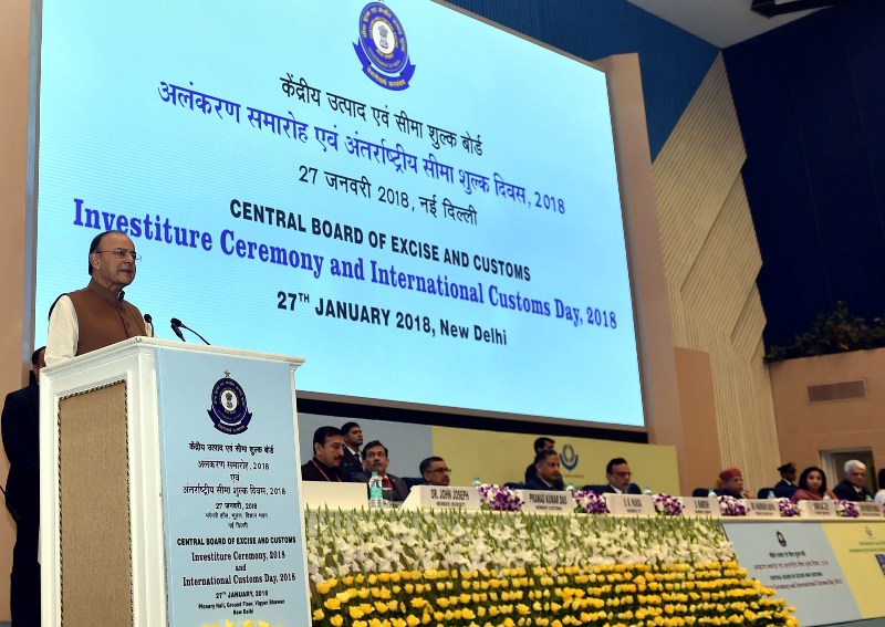 The Union Minister for Finance and Corporate Affairs, Arun Jaitley addressing at the Investiture Ceremony and International Customs Day 2018, in New Delhi on January 27, 2018.