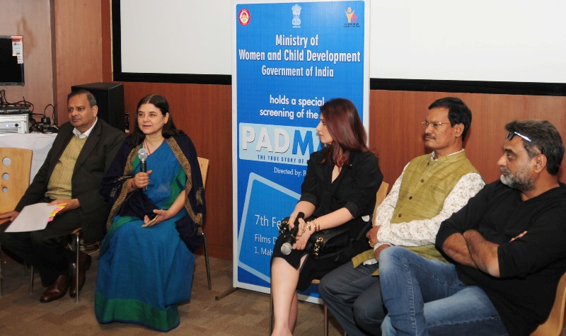 The Union Minister for Women and Child Development, Maneka Sanjay Gandhi interacting with the media at a Special Screening of the film ‘Padman’, in New Delhi on February 07, 2018. The Secretary, Ministry of Women and Child Development, Rakesh Srivastava and the Producer of the film Padman, Twinkle Khanna are also seen.