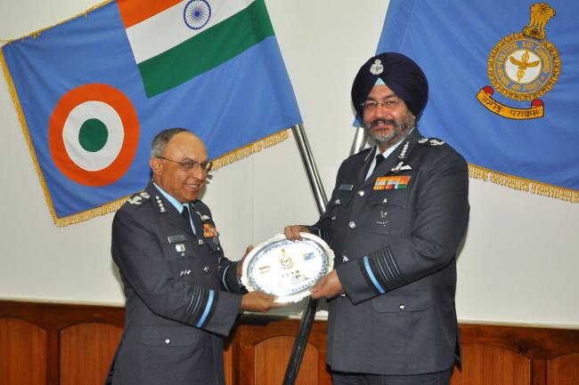 The Chief of the Air Staff, Air Chief Marshal B.S. Dhanoa presenting a memento to the Air Officer Commanding-in-Chief, Eastern Air Command, Air Marshal Anil Khosla, at HQ Eastern Air Command, at Upper Shillong on November 21, 2017.
