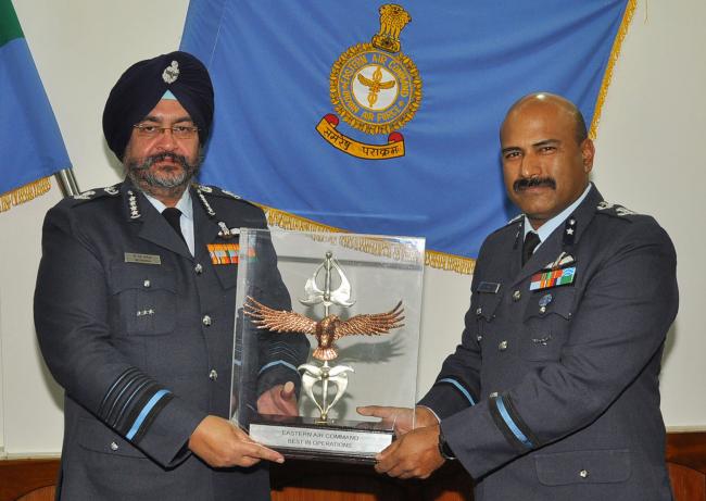 Air Commodore George Thomas, Air Officer Commanding, Air Force Station, Chabua receiving the ‘Pride of EAC Trophy’ from the Chief of the Air Staff, Air Chief Marshal B.S. Dhanoa, at HQ Eastern Air Command, at Shillong on November 21, 2017.
