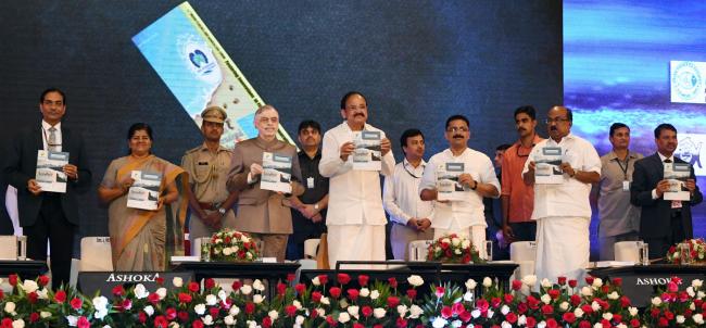 The Vice President, M. Venkaiah Naidu releasing the Souvenir on the 11th Indian Fisheries and Aquaculture Forum, in Kochi, Kerala on November 21, 2017. The Governor of Kerala, P. Sathasivam, the Minister for Fisheries, Harbour Engineering & Cashew Industry, Kerala, J. Mercykutty Amma, the Minister for Local Self-Governments, Welfare of Minorities, Wakf and Haj, Kerala, Dr. K.T. Jaleel and other dignitaries are also seen.