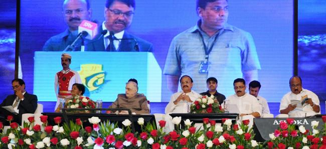 The Vice President, M. Venkaiah Naidu addressing the 11th Indian Fisheries and Aquaculture Forum, in Kochi, Kerala on November 21, 2017. The Governor of Kerala, P. Sathasivam, the Minister for Fisheries, Harbour Engineering & Cashew Industry, Kerala, J. Mercykutty Amma, the Minister for Local Self-Governments, Welfare of Minorities, Wakf and Haj, Kerala, Dr. K.T. Jaleel and other dignitaries are also seen.