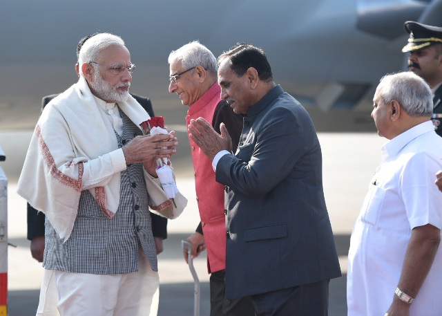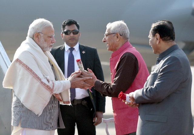 The Prime Minister, Narendra Modi being received by the Governor of Gujarat, O.P. Kohli and the Chief Minister of Gujarat, Shri Vijay Rupani, on his arrival, at Ahmedabad, Gujarat on January 17, 2018.