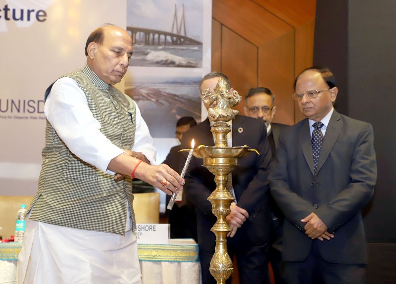The Union Home Minister, Rajnath Singh lighting the lamp to inaugurate the International Workshop on Disaster Resilient Infrastructure (IWDRI), in New Delhi on January 15, 2018. The Additional Principal Secretary to the Prime Minister, P.K. Mishra is also seen.