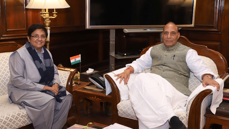 The Lieutenant Governor of Puducherry, Dr. Kiran Bedi calling on the Union Home Minister, Shri Rajnath Singh, in New Delhi on January 15, 2018.