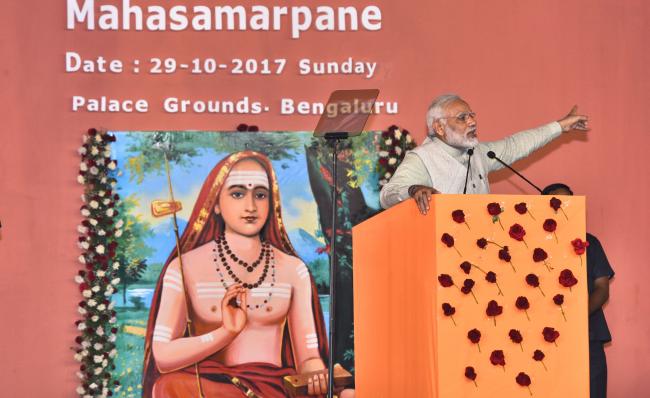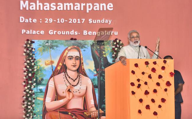 The Prime Minister, Narendra Modi addressing the gathering at the Dashamah Soundarya Lahari Parayanotsava Mahasamarpane, in Bengaluru, Karnataka on October 29, 2017.