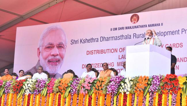 The Prime Minister, Narendra Modi addressing a public meeting, at Ujire, in Karnataka on October 29, 2017. The Union Minister for Statistics and Programme Implementation, D.V. Sadananda Gowda, the Union Minister for Chemicals & Fertilizers and Parliamentary Affairs, Ananth Kumar and other dignitaries are also seen.