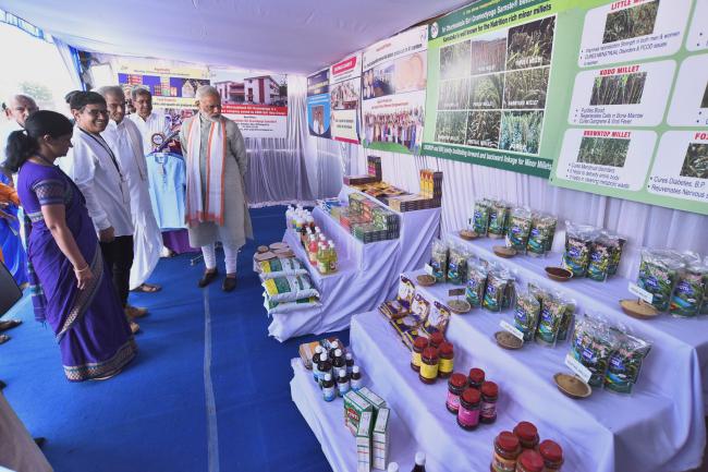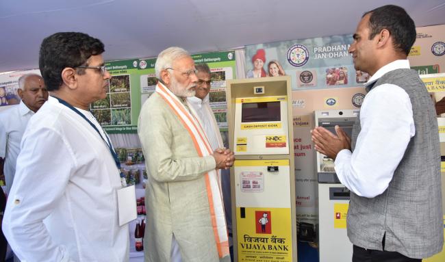 The Prime Minister, Narendra Modi walks through the Self Help Group product stalls and E- Lobby of Vijaya Bank, at Ujire, in Karnataka on October 29, 2017