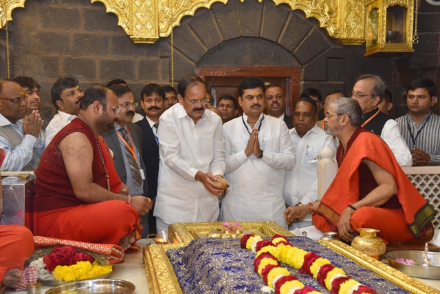The Vice President, M. Venkaiah Naidu performing prayers at Sai Baba Temple, in Shirdi, Maharashtra on December 23, 2017. The Guardian Minister of Ahmednagar, Maharashtra, Prof. Ram Shinde and other dignitaries are also seen.