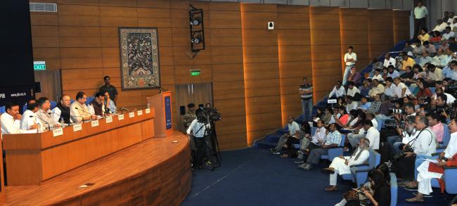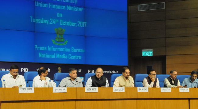 The Union Minister for Finance and Corporate Affairs, Arun Jaitley addressing a press conference, in New Delhi on October 24, 2017. The Finance Secretary, Ashok Lavasa, the Revenue Secretary, Dr. Hasmukh Adhia, the Principal Director General (M&C), Press Information Bureau, A.P. Frank Noronha and other dignitaries are also seen.
