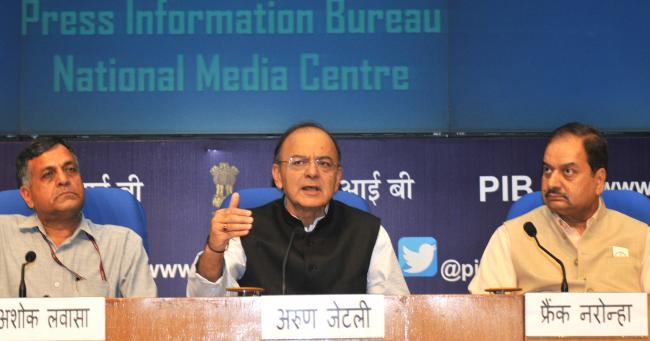 The Union Minister for Finance and Corporate Affairs, Arun Jaitley addressing a press conference, in New Delhi on October 24, 2017. The Finance Secretary, Ashok Lavasa and the Principal Director General (M&C), Press Information Bureau, A.P. Frank Noronha are also seen.