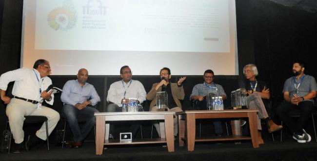 The Filmmaker Panelists: Shekhar Kapur, Sudhir Mishra, Karan Anshuman Vijay Subramaniam, Sameer Nair and Moderator, Bharatbala Ganapathy, at the Panel Discussion , during the 48th International Film Festival of India (IFFI-2017), in Panaji, Goa on November 25, 2017.