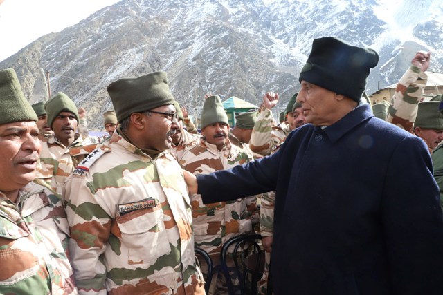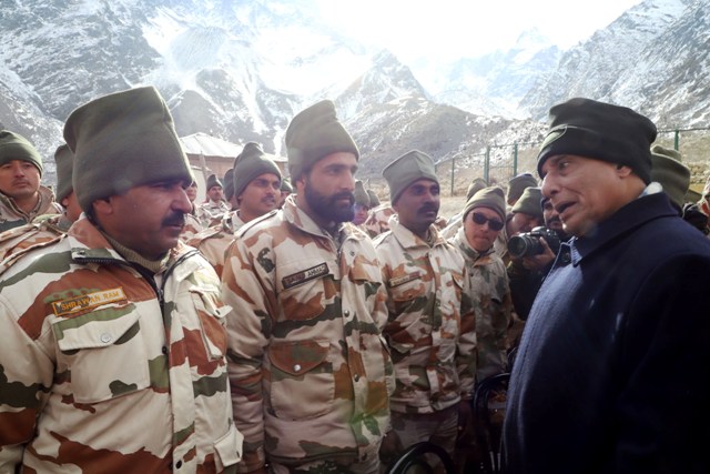 The Union Home Minister, Rajnath Singh addressing the Jawans of Indo-Tibetan Border Police (ITBP), at Nelong Border Out-Post (BOP), in Uttarkashi on January 01, 2018.