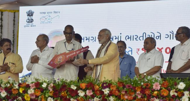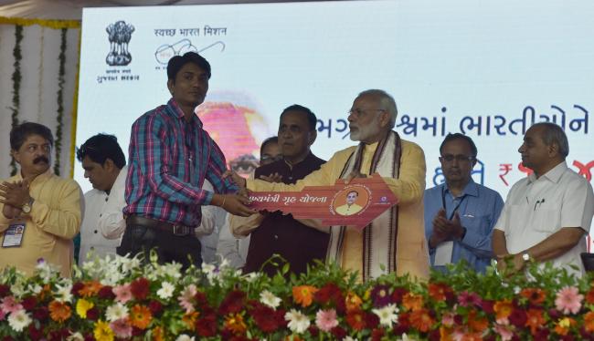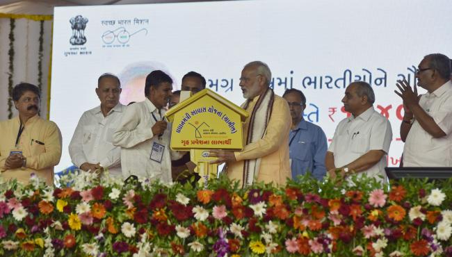 The Prime Minister, Narendra Modi handing over the keys of houses to beneficiaries under the Pradhan Mantri Awas Yojana, in Vadodara, Gujarat on October 22, 2017. The Chief Minister of Gujarat, Vijay Rupani and the Deputy Chief Minister of Gujarat, Nitinbhai Patel are also seen.