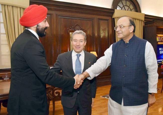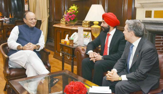 The Minister of International Trade, Canada, Francois Philippe Champagne and the Minister of Innovation, Science and Economic Development, Navdeep Singh Bains call on the Union Minister for Finance and Corporate Affairs, Arun Jaitley, in New Delhi on November 13, 2017.