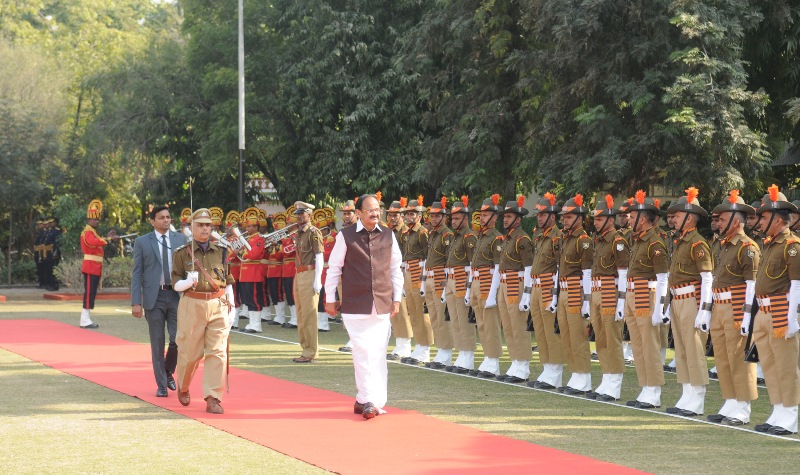 The Vice President, M. Venkaiah Naidu being presented the Guard of Honour, on his arrival, at the Raj Bhawan, in Jaipur on January 06, 2018.