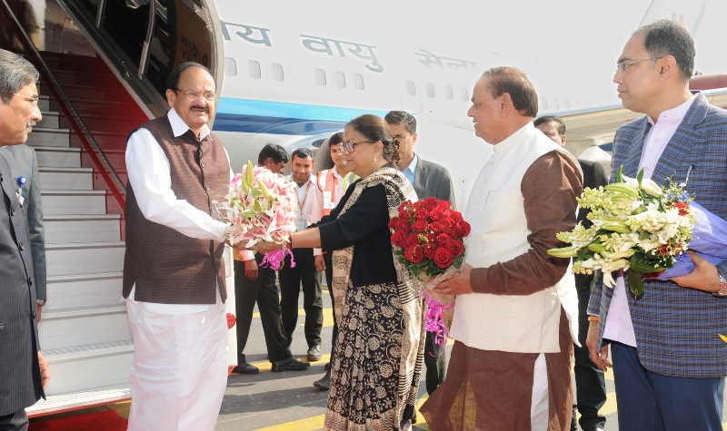 The Vice President, M. Venkaiah Naidu being received by the Chief Minister of Rajasthan, Smt. Vasundhara Raje, on his arrival, in Jaipur on January 06, 2018.