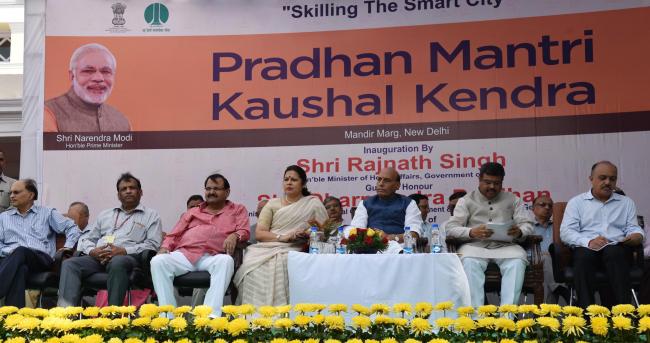 The Union Home Minister, Rajnath Singh addressing at the inauguration of the Pradhan Mantri Kaushal Kendra, at Mandir Marg, in New Delhi on October 23, 2017. The Union Minister for Petroleum & Natural Gas and Skill Development & Entrepreneurship, Dharmendra Pradhan and other dignitaries are also seen.